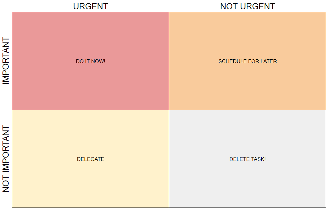 In short, prioritize important and urgent work. Schedule important tasks. Delegate or delete the rest.