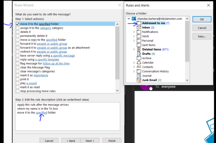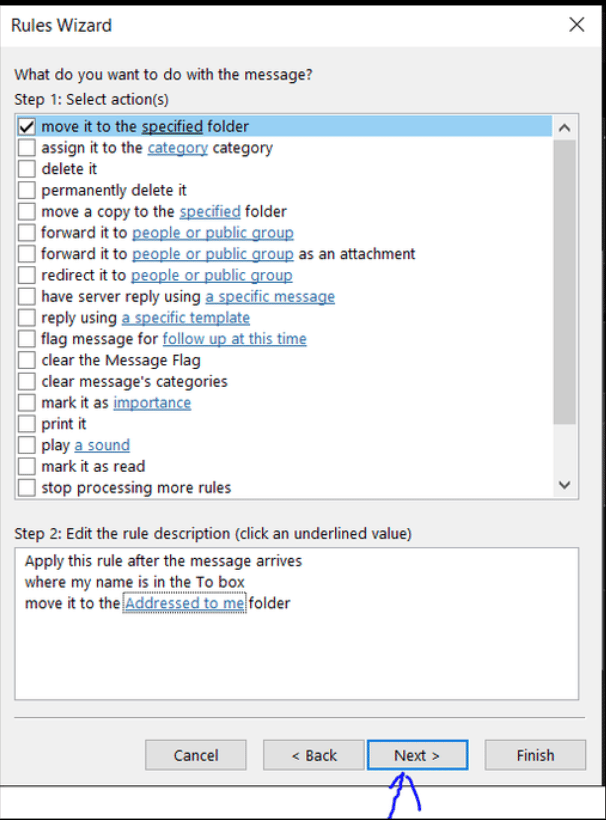“Move to specified folder” --> “Specified” --> “Addressed to me” --> OK: