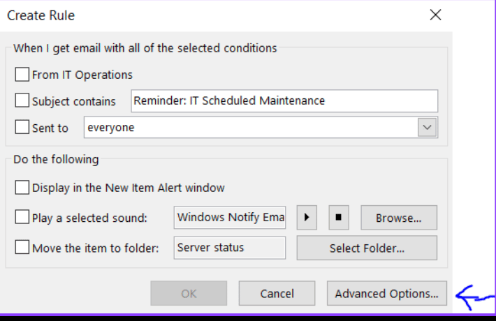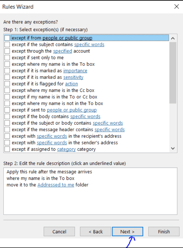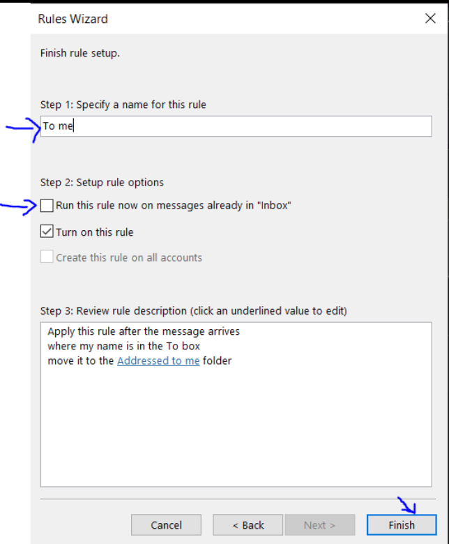 Name the rule. Select “Run this rule on messages already in “Inbox” ----> Finish.