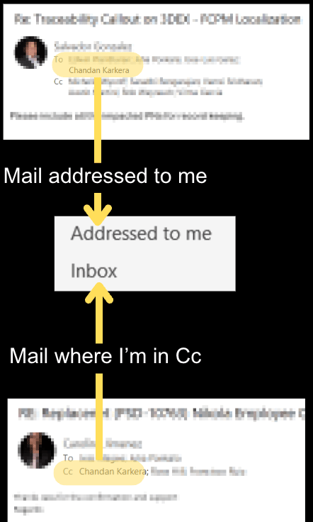 Now the “Addressed to me” folder is your priority. Always look at this first - it will contain mails where you have an action to do. This method has saved me 100's of hours till now. And I hope it helps you too.