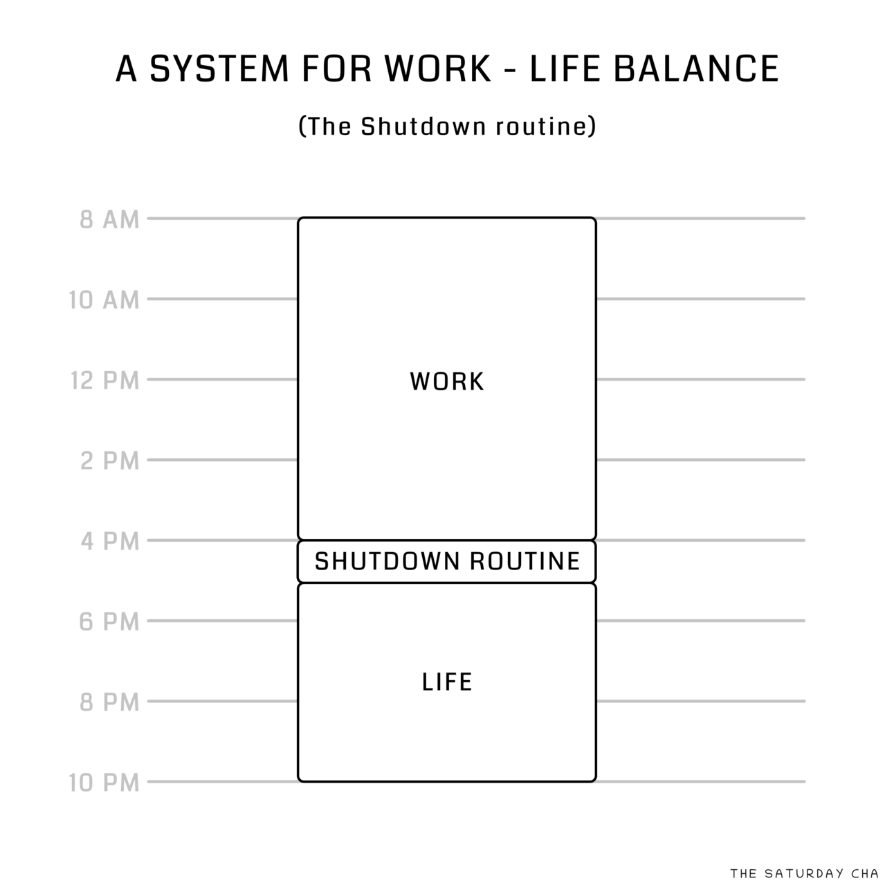 It is a set of actions you can do at the end of your work day. This tells your brain “work is done, now it’s time to play”. It gives the mind a structured way to wind down. And close open loops so you can free your mind.