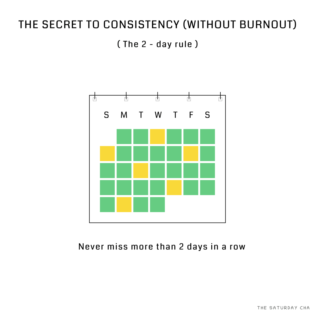 Fortunately, I came across a simple system for peak consistency. Enter the 2 - day rule. The mantra is simple - never miss 2 days in a row. Matt D'Avella popularized the idea.